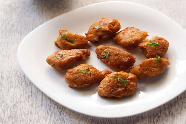 Make a thick batter with water, flour, red chilli powder, cumin, turmeric, salt and soda bi-carb.