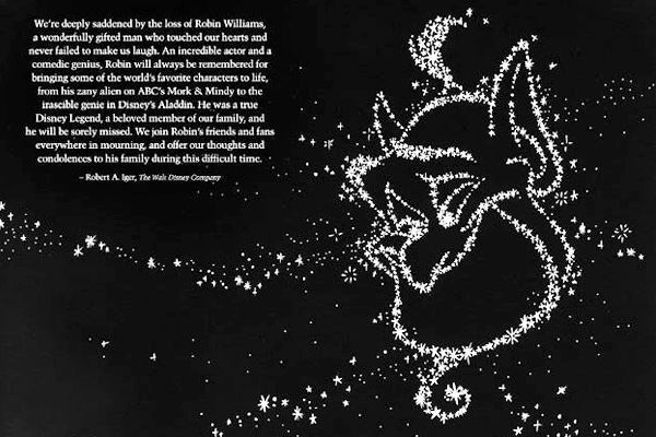 "We're deeply saddened by the loss of Robin Williams, a wonderfully gifted man who touched our hearts and never failed to make us laugh. An incredible actor and a comedic genius, Robin will always be remembered for bringing some of the world's favorite characters to life, from his zany alien on ABC's Mork & Mindy to the irascible genie in Disney's Aladdin. He was a true Disney Legend, a beloved member of our family, and he will be sorely missed. We join Robin's friends and fans everywhere in mourning, and offer our thoughts and condolences to his family during this difficult time."