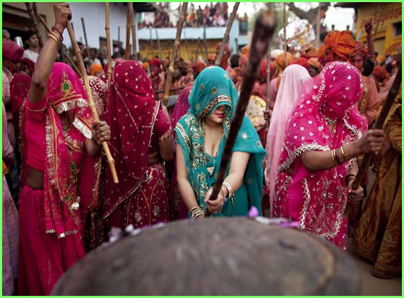 In a Holi tradition unique to India's Barsana and Nandgaon villages, men sing stimulating songs to gain the attention of women, who then "beat" them with bamboo sticks called "lathis".