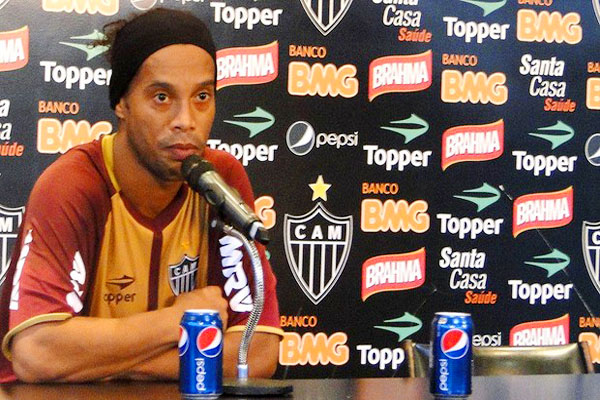 Ronaldinho attended the press conference to talk about his upcoming game with his new club Atletico Mineiro. Two cans of Pepsi were placed on the table in front of him, and the 32-year-old sipped from one of them.