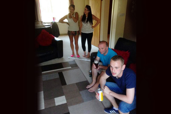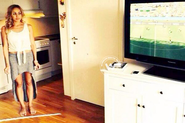 Quite an innovative way to watch football. Ladies you can copy the act later when you want to watch your favourite soaps.