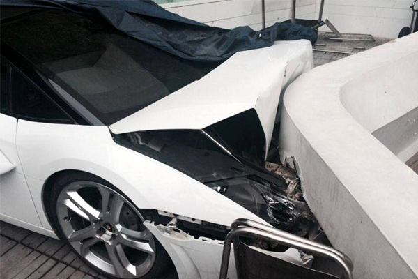 The car suffered extensive damage in its front end as the hotel worker smashed the Lamborghini into a concrete wall.