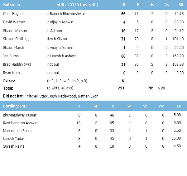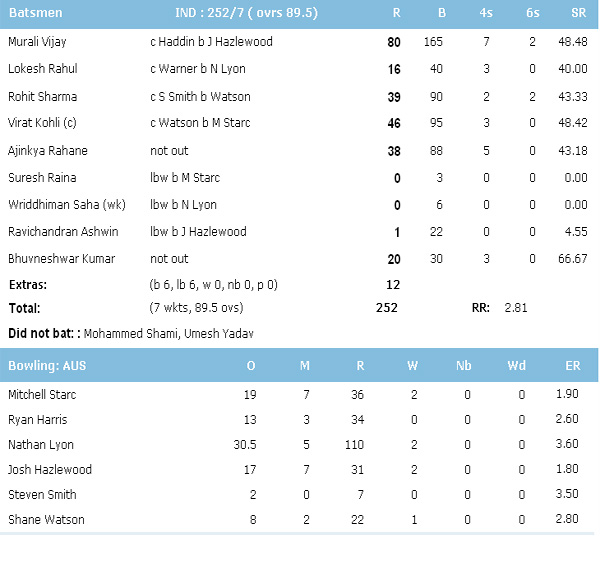 This morning Australia declared their innings at their overnight score 251 for six, leaving India to chase 349 runs in 90 overs to win the last match. Murali Vijay scored 80 of 165 balls and Rohit Sharma, Kohli and Rahane tried to save India from losing the match to Australia. Suresh Raina and Wriddhiman Saha failed to defend and to open the account. Ravichandran Ashwin protected India from Australian bowlers with bat and scored 1 run in 22 deliveries. Ajinkya Rahane (38) and Bhuvaneshwar Kumar (20) was on crease till match draws hung.