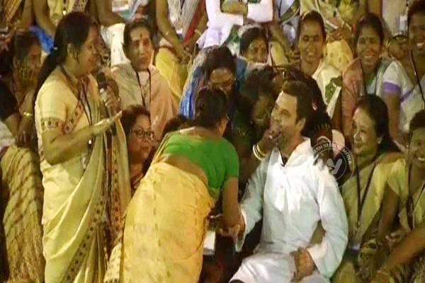 Some women came up to the 43-year-old Gandhi to shake his hand. Two female fans were so thrilled to meet him that they expressed their happiness by kissing him. One women kissed his forehead while another went a step ahead and gave a peck on his cheek. The Congress leader had not anticipated such warm welcome from the women and was left embarrased.