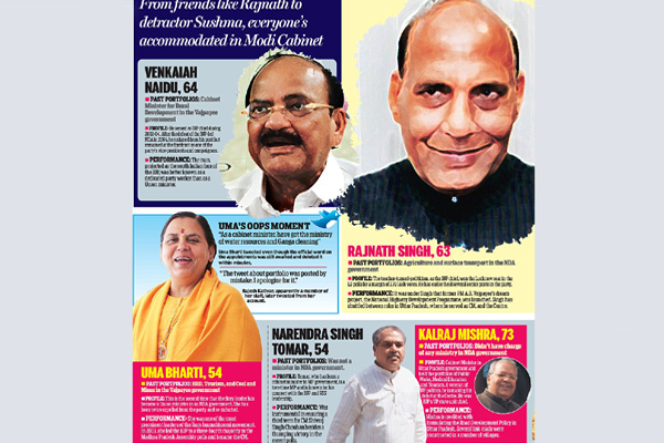 After days of speculation, the suspense finally drew to a close over Modi's cabinet, as he along with his compact 45-person cabinet took oath at the Rashtrapati Bhawan on Monday. Here take a look at the faces who will form Modi's new sarkar and their portfolio allocation.