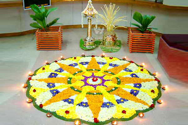 Celebration starts early in the morning. People clean their homes, make rice flour designs at the main entrance (a traditional welcome sign), take an early bath, wear new clothes and distribute alms to the poor. Special prayers are offered in temples, churches and mosques, highlighting the secular nature of this festival. Each family prepares a Pookkalam to welcome King Mahabali. Ona Sadya is the highlight of the day when families eat around 25 food item to mark the festivity.