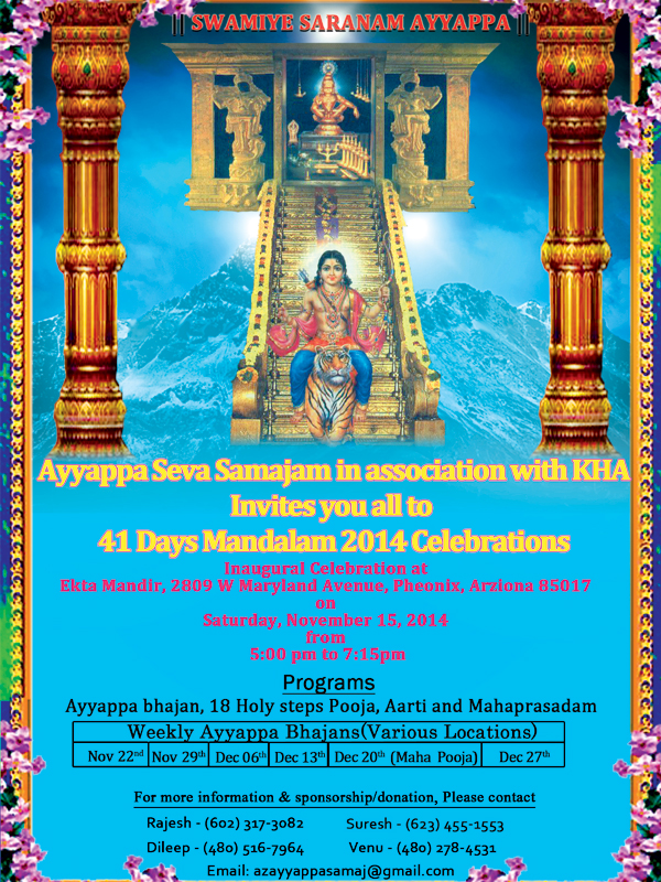 Ayyappa Seva Samajam in association with KHA (Kerala Hindus of Arizona) invites all to paricipate in the inaugural celebration of 41 days of mandalam at Ekta Mandir in Phoenix, Arizona. The inaugural celebration of Mandala Pooja will be held on Saturday, November 15 from 5 pm onwards to 7.15 pm.